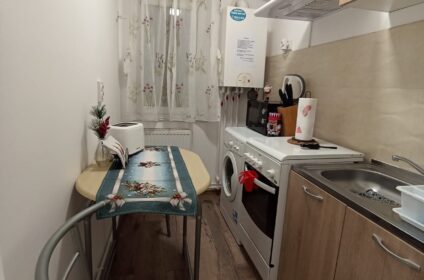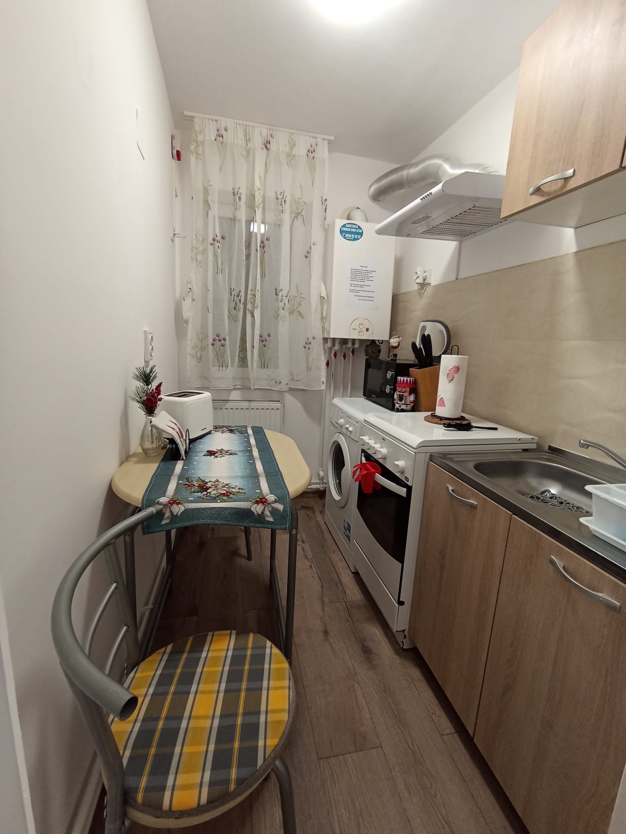- Bucătărie Utilată: Bucătăria este complet echipată, incluzând aragaz cu cuptor, cuptor cu microunde, mașină de spălat haine, centrală proprie, hotă, cană fierbător, filtru pentru cafea, prăjitor de pâine, vase și tacâmuri.