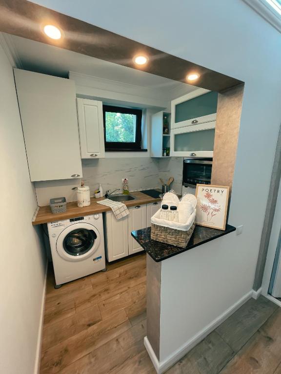 De la intrare, veți fi întâmpinat de living-ul aerisit, o canapea extensibilă confortabilă. Un smart TV cu ecran plat și o măsuță de cafea mică care se poate transforma la nevoie, într-o masă la care se pot așeza 6 persoane. Bucătăria este complet utilată cu tot ce aveți nevoie pentru a pregăti mesele. Inclusiv un frigider și un cuptor mic. Baia este modernă și curată, dotată cabină de duș de tip walk-in, wc suspendat și prosoape curate.
